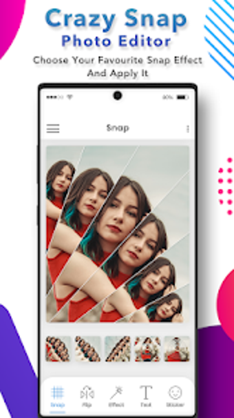 Crazy Snap Photo Effect, Android platformu için geliştirilmiş bir fotoğraf düzenleme uygulamasıdır. Kullanıcılar, bu uygulama sayesinde birçok farklı kategoriye ait eğlenceli ve ilginç ayna efektleri oluşturabilir. Uygulama, ikiz ayna efektleri, yansıma efektleri ve yankı ayna efektleri gibi çeşitli seçenekler sunar. Kullanımı kolay arayüzü ile fotoğraflar üzerinde basit dokunma hareketleriyle döndürme, boyutlandırma ve yakınlaştırma işlemleri yapılabilir.